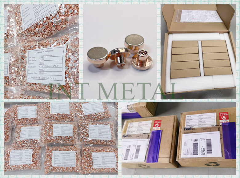 డోంగువాన్ INT మెటల్ టెక్ CO LTDకోల్డ్ ప్రెస్సింగ్ కాంపోజిట్ (కోల్డ్ హెడ్డింగ్) ప్రక్రియను అవలంబిస్తుంది, ఇది విపరీతమైన ఒత్తిడి ద్వారా ఘన స్థితిలో వెండి లేదా వెండి మిశ్రమాన్ని రాగితో కలుపుతుంది. ఈ ప్రక్రియ వెండి పొర యొక్క ఏకరీతి మందాన్ని మరియు అధిక బంధన బలాన్ని నిర్ధారిస్తుంది వెండి పరిచయాలుద్వారా ఉత్పత్తి చేయబడిందిINT మెటల్కస్టమర్ ఉత్పత్తుల జీవితకాల విశ్వసనీయతకు హామీ ఇవ్వగలదు.